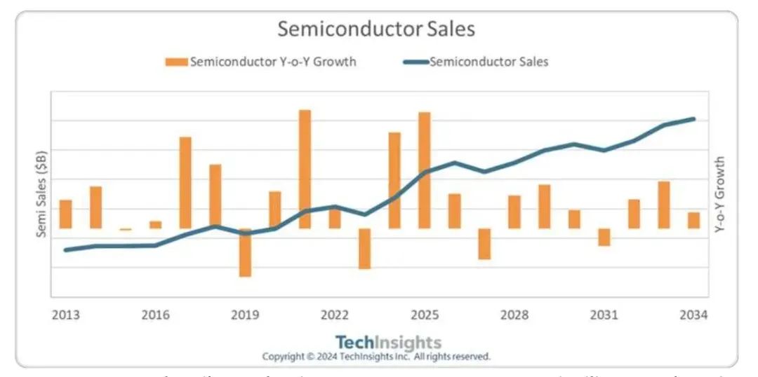 人工智能(AI)技術(shù)的迅猛發(fā)展正推動半導體產(chǎn)業(yè),研究機構(gòu)TechInsights預測,全球半導體產(chǎn)業(yè)銷售額預計將在2030年達到1萬億美元大關(guān);此外,預計到2034年,集成電路(IC)銷售總額將達到1萬億美元。根據(jù)機構(gòu)預測,2025年半導體產(chǎn)業(yè)將創(chuàng)下增長率峰值,隨后在2027年可能出現(xiàn)負增長,但總體將保持波動上升趨勢。機構(gòu)表示,在IC各個細分市場中,DRAM(動態(tài)隨機存取存儲器)預計將呈現(xiàn)出最強勁的增長勢頭,未來十年的收入將翻一番以上。集成電路需求的激增與AI的廣泛應用密切相關(guān),AI推動了半導體平均銷售價格(ASP)的上漲,從而提高了整體收入。除了AI領(lǐng)域,機構(gòu)認為其它因素也在影響半導體產(chǎn)業(yè)發(fā)展軌跡,比如不斷擴大的數(shù)字經(jīng)濟、電動汽車的興起等。根據(jù)美國半導體行業(yè)協(xié)會(SIA)預測,2024年全球半導體銷售額將達6112億美元,同比增長15.8%;世界半導體貿(mào)易統(tǒng)計組織(WSTS)同樣發(fā)布預測,預計這一數(shù)據(jù)增幅將達到16.0%。